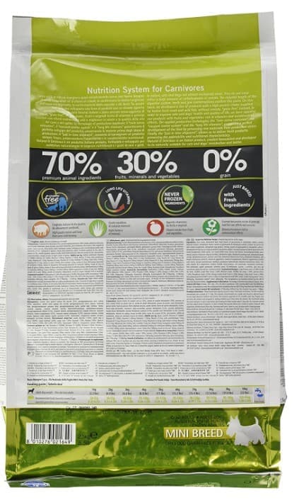 свежее мясо дикого кабана без костей(22%), дегидратированное мясо кабана (20%), картофель, свежее мясо курицы без костей, дегидратированное мясо курицы, куриный жир, дегидратированные цельные яйца, дегидратированная рыба, рыбий жир, волокна гороха, сушеная морковь, сушеная люцерна, инулин, фруктоолигосахариды, маннанолигосахариды, дегидратированные яблоки (0,5%), порошок граната, дегидратированный сладкий апельсин, порошок шпината, семена подорожника (0,3%), порошок черной смородины (0,3%), порошок черники, хлорид натрия, дрожжи сухие пивные, корень куркумы (0,2%), глюкозамин, хондроитин сульфат, экстракт календулы (источник лютеина).