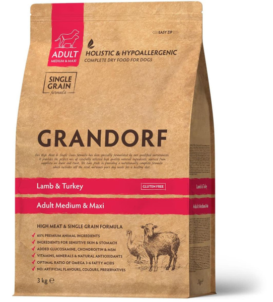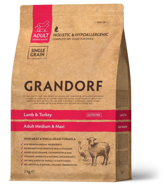 Grandorf Adult All Breeds (ягненок, рис) - это гипоаллергенный корм для взрослых собак средних пород старше 1 года.
