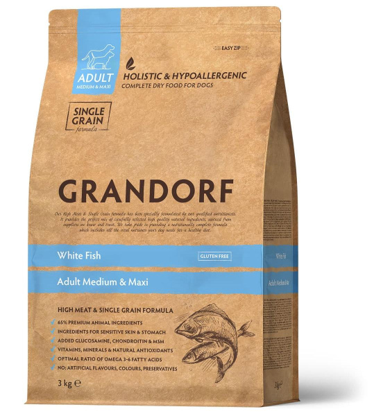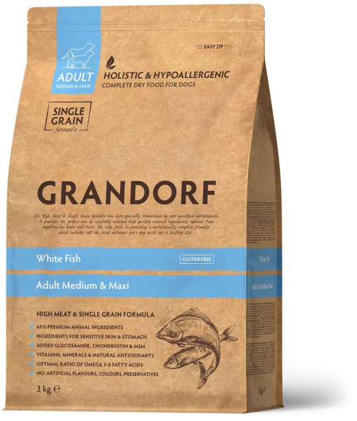 Grandorf Adult Medium & Maxi (белая рыба) - это гипоаллергенный корм для взрослых собак всех пород старше 1 года.
