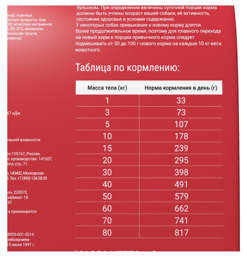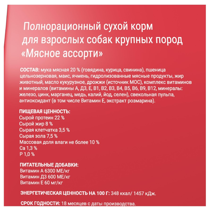 Состав: Мука мясная 20% (говядина, курица, свинина), пшеница цельнозерновая, маис, ячмень, гидролизованные мясные продукты, жир животный, масло кукурузное, дрожжи (источник МОС), комплекс Витаминов и минералов (Витамины А, Д3, Е, В1, В2, В3, В4, В5, В6, В9, В12, минералы: Железо (Fe), Цинк (Zn) (Zn), Марганец (Mn), Медь (Cu), калий, Йод (I), Селен (Se) (Se)), свекольная пульпа, антиоксидант (в том числе Витамин Е, экстракт розмарина).