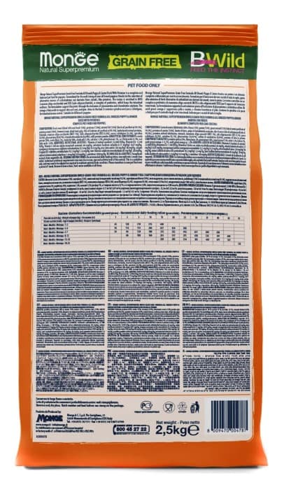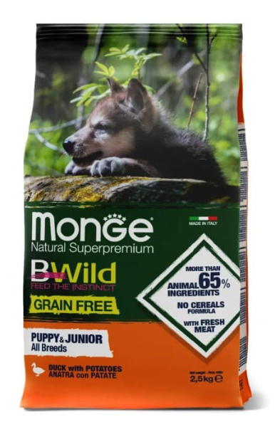 Monge (Монж) Dog BWild GRAIN FREE Puppy & Junior (холистик) беззерновой сухой корм из мяса утки с картофелем для щенков всех пород в возрасте от 1 до 12 месяцев.