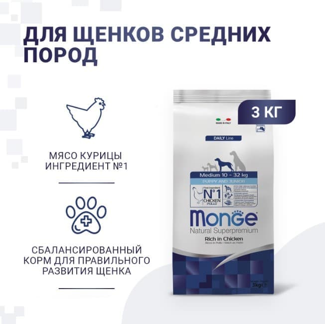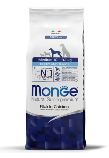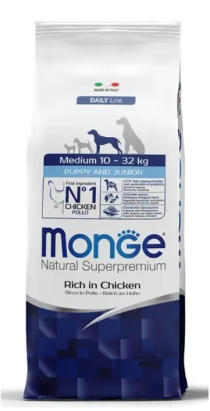 Monge Dog Daily Line Medium Puppy & Junior из курицы и риса - сухой полноценный корм для щенков средних пород от 2 мес., среднего размера (10–32 кг).