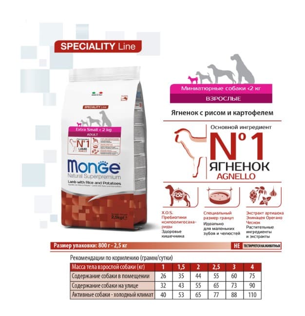 Monge Dog Speciality Extra Small - это сухой корм для взрослых собак миниатюрных пород ягненок с рисом и картофелем.