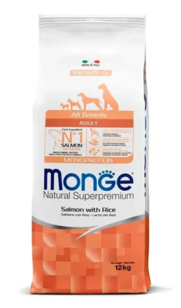 Monge (Монж) Dog Speciality Line Monoprotein сухой корм из мяса лосося с рисом для взрослых собак всех пород в упаковке 2,5 кг, 15 кг.