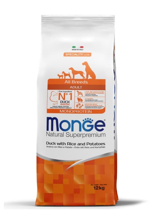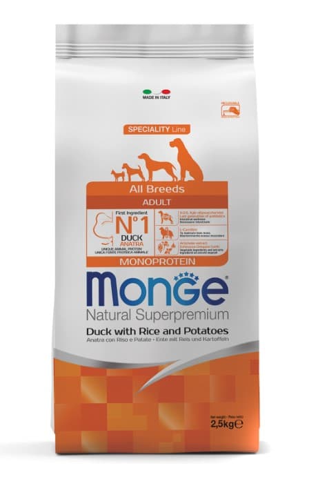 Monge (Монж) Dog Speciality Line Monoprotein сухой корм из мяса утки с рисом для взрослых собак всех пород в фасовке 2,5 кг и 15 кг.