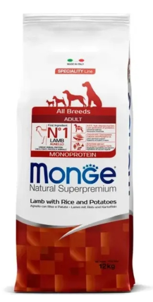 Monge Dog Monoprotein Adult All Breeds это сухой корм для собак всех пород ягненок с рисом и картофелем.