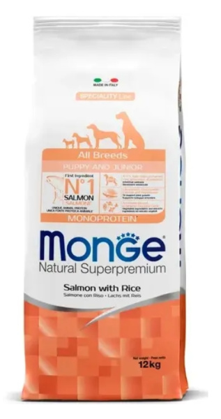 Monge Dog Monoprotein Puppy & Junior - это сухой корм для щенков всех пород от 2 до 12месяцев с лососем и рисом.