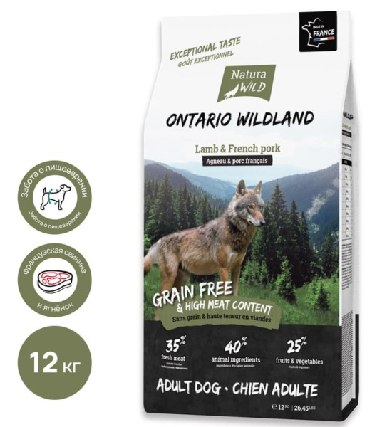 Natura Wild DOG Ontario Wildland (ягненок, французская свинина) - беззерновой сухой корм для привередливых собак всех пород. Не содержит рыбу для удовлетворения потребностей собак, которые могут быть нетерпимы к рыбе.