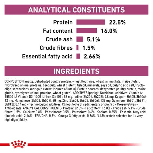 1 Страна производителя: Франция, Австрия, Россия Производитесь (завод): ROYAL CANIN SAS 30470 Aimargues Franse Импортер в РБ: ЧУП "РусканБел", Минская обл.,Минский р-н,Щомыслицкий с/с,с/с Щомыслицкий,д.28/1,ТЛЦ "Щомыслица", адм. пом. №24 Условия и сроки хранения: Дата изготовления, номер партии, условия хранения, срок годности указаны на упаковке. Данная информация о товаре предоставлена исключительно в целях ознакомления и не является публичной офертой. Производители оставляют за собой право изменять внешний вид, характеристики и комплектацию товара, предварительно не уведомляя продавцов и потребителей. Просим вас отнестись с пониманием к данному факту и заранее приносим извинения за возможные неточности в описании и фотографиях товара. Будем благодарны вам за сообщение об ошибках — это поможет сделать наш каталог еще точнее!