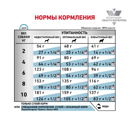 При подозрении на пищевую аллергию или пищевую непереносимость следует перевести собаку на специальную диету без соблюдения переходного периода. Диета Hypoallergenic SMALL DOG может применяться на протяжении всей жизни животного. Рекомендуется разделять дневную порцию корма на два приема.