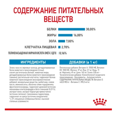ИНГРЕДИЕНТЫ: дегидратированные белки животного происхождения (птица), рис, мука из зерновых культур, дегидратированные белки животного происхождения (свинина), животные жиры, изолят растительных белков*, растительная клетчатка, пшеница, минеральные вещества, пшеничная мука, гидролизат белков животного происхождения (вкусоароматические добавки), соевое масло, рыбий жир, оболочка и семена подорожника, фруктоолигосахариды (0,34 %), гидролизат дрожжей (источник мaннановых олигосахаридов), экстракты дрожжей (источник бета-глюканов), экстракт бархатцев прямостоячих (источник лютеина), гидролизат из панциря ракообразных (источник глюкозамина), гидролизат из хряща (источник хондроитина).