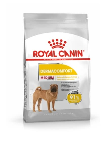 Royal Canin Medium Dermacomfort - сухой полнорационный корм для взрослых и стареющих собак средних размеров при раздражениях и зуде кожи, связанных с повышенной чувствительностью.