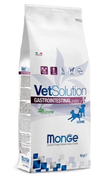 Лечебный корм для щенков Monge VetSolution Dog Gastrointestinal Puppy Гастроинтестинал - диетическое питание для щенков при заболеваниях желудочно-кишечного тракта, таких как острый и хронический гастрит, расстройства моторики желудка энтерит и воспалительные заболевания кишечника, энтеропатии с потерей белка, синдром короткой кишки и избыточный бактериальный рост в тонком отделе кишечника, колит, а так же при остром и хроническом панкреатите (для щенков, НЕ страдающих ожирением и гипертриглицеридемией).