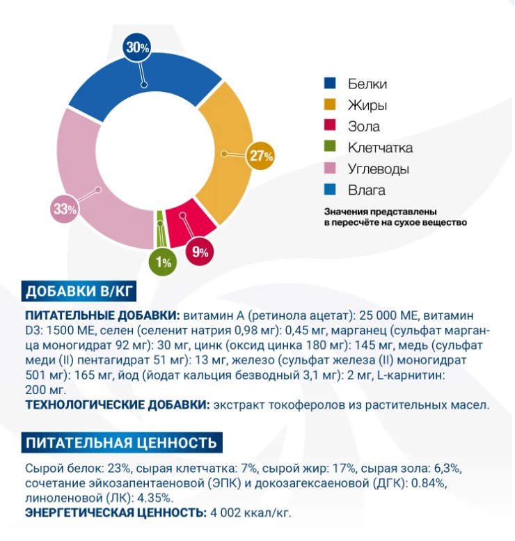 Питательная ценность: сырой белок: 23%, сырая клетчатка: 7%, сырой жир: 17%, сырая зола: 6,3%, сочетание эйкозапентаеновой (EPA) и докозагексаеновой (DHA): 0.84%, линоленовой (LA): 4.35%.