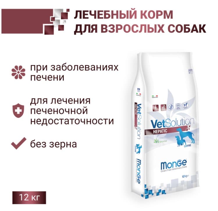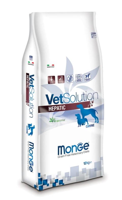 Лечебный корм для собак Monge (Монж/Монже) VetSolution Dog Hepatic при заболеваниях печени у собак, таких как печеночная недостаточность, хронический гепатит, фиброз печени, нарушение метаболизма меди при печеночной энцефалопатии, пироплазмоз, желтуха.