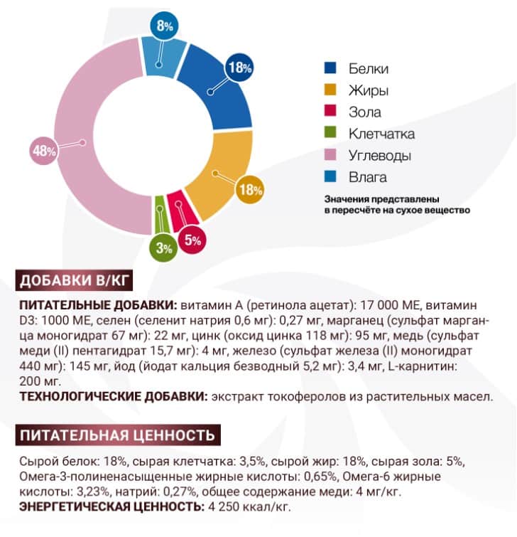 сырой белок: 18%, сырая клетчатка: 3,5%, сырой жир: 18%, сырая зола: 5%, Омега-3 жирные кислоты: 0,65%, Омега-6 жирные кислоты: 3,23%, натрий: 0,27%, общее содержание меди: 4 мг/кг.