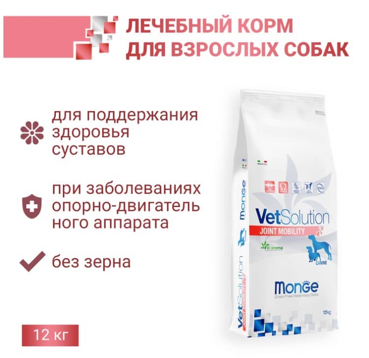 Лечебный корм для собак Monge (Монж/Монже) VetSolution Dog Joint Mobility - это диетическое питание при заболеваниях суставов, таких как остеоартрит и артроз у собак.