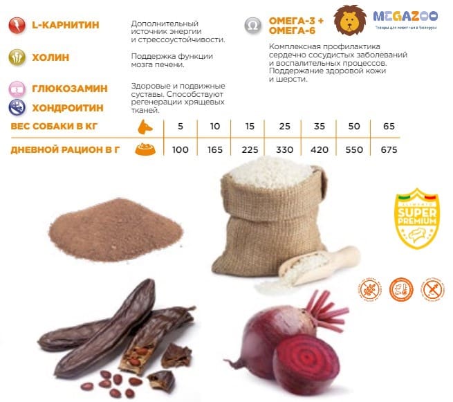 Состав: Белая рыба (6%) (дегидратированная белая рыба 6%), цельная кукуруза, кукурузная мука, свинина (26%) (дегидратированная свинина 26%), животный жир (свинина), рис (7%), рожковая мука, сушеный свекольный жом, карбонат кальция, хондроитин (78 мг/кг), глюкозамин (78 мг/кг), комплекс минеральных веществ и витаминов.