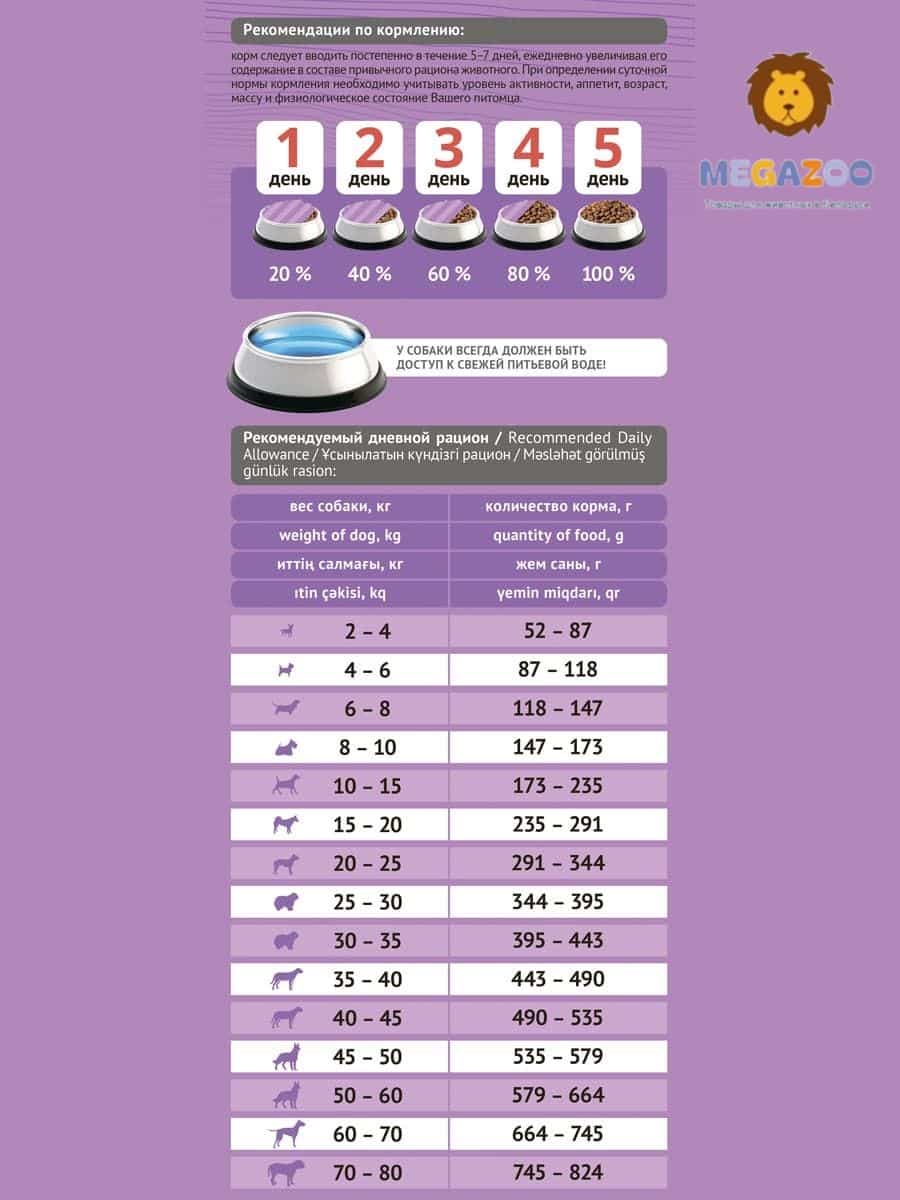 Гарантированный анализ: протеин – 25%, жир – 13%, клетчатка – 3,5%, зола – 7,5%, влажность – 10%, кальций – 1,6%, фосфор – 1,1%.