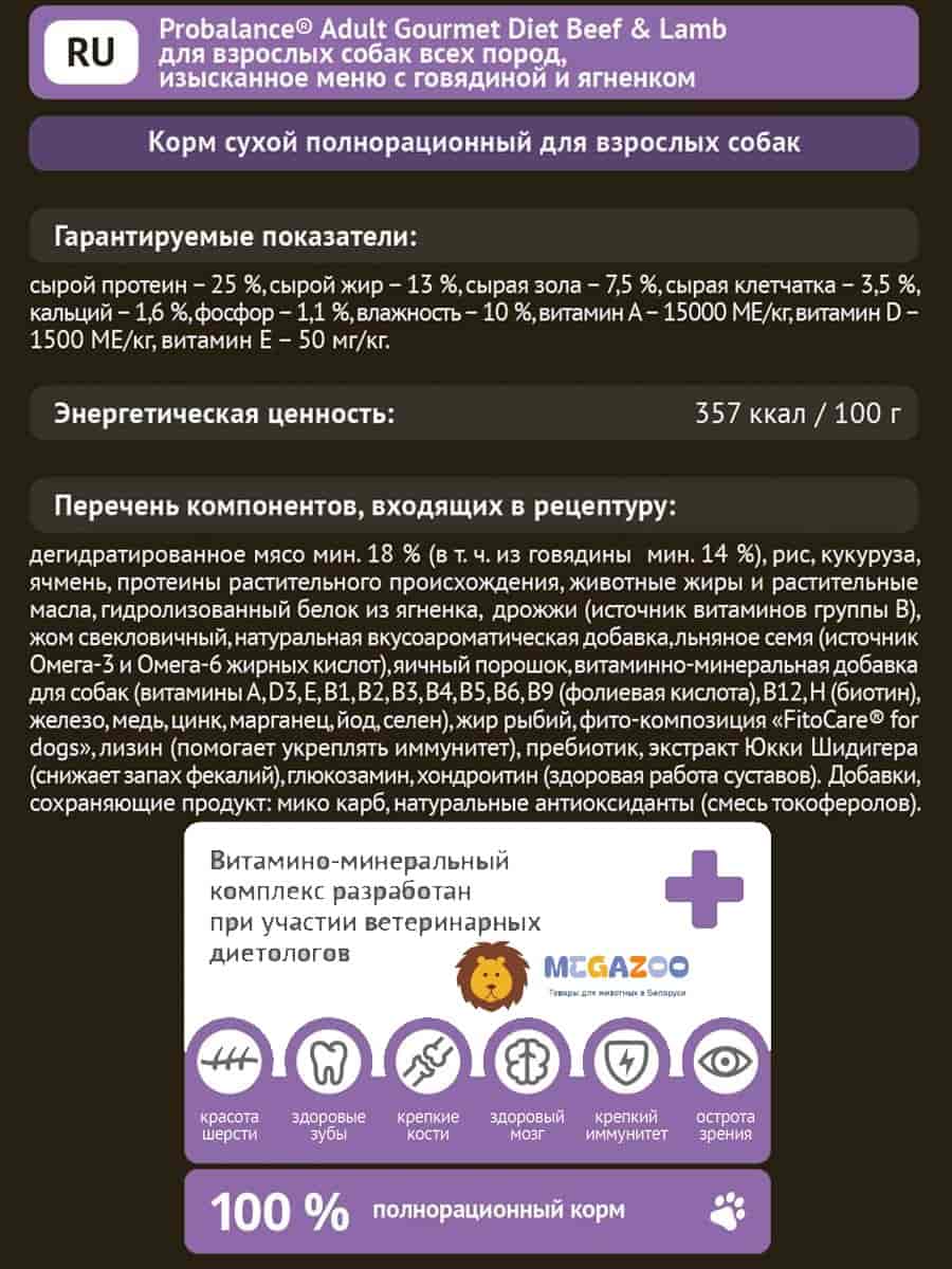 Корм для собак ProBalance Dog Gourmet Diet Beef & Lamb (говядина, ягненок) - сухой гипоаллергенный корм подходит питомцам привередам и собакам с аллергией на курицу (в составе нет куриного белка).