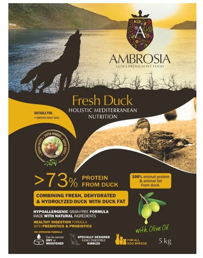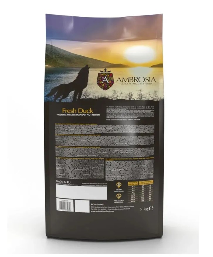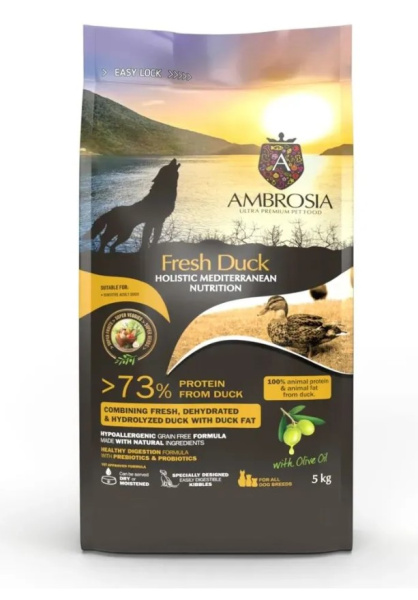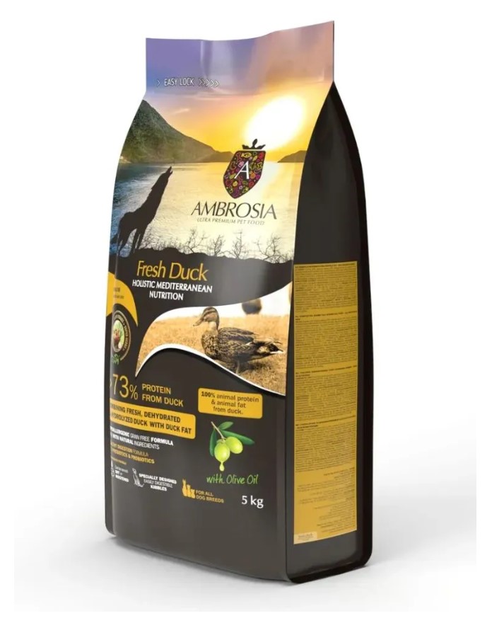 Все наши продукты Ambrosia не содержат ГМО и искусственных красителей. Они также свободны от зерновых, кукурузы и сои. Все рецепты сочетают высококачественные источники белка и оливковое масло, чтобы создать уникальный вкус. Гидролизованный белок также используется для повышения гипоаллергенных свойств пищи. Добавление пребиотиков и пробиотиков способствует пищеварительному здоровью, в то время как хорошее соотношение Омега З и Омега 6 помогают поддерживать здоровую кожу и шерсть. Ambrosia's Fresh Duck - превосходный беззерновой корм для всех пород чувствительных взрослых собак.