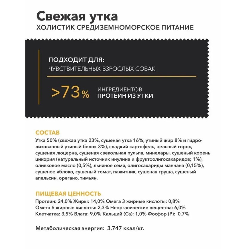 Утка 50% (свежая утка 23%, сушеная утка 16%, утиный жир 8% и гидролизованный утиный белок 3%), сладкий картофель, цельный горох, сушеная люцерна, сушеный жом свеклы, минералы, сушеный корень цикория (естественный источник инулина и фрукто-олигосахаридов; 1%), оливковое масло (0,5%), льняное семя, маннановые олигосахариды (0,15%), сушеное яблоко, сушеный помидор, пажитник, сушеная груша, сушеный апельсин, орегано, тимьян.