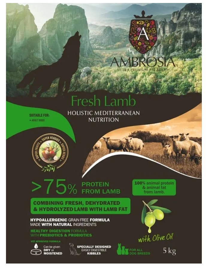 Наш рецепт Ambrosia Fresh Lamb сочетает в себе преимущества высококачественного, легкоусвояемого и гипоаллергенного белка, получаемого из свежей баранины. С правильным количеством оливкового масла и смесью средиземноморских фруктов и трав мы предлагаем гипоаллергенный, средиземноморский, беззерновой корм для собак, полный антиоксидантов, подходящий для всех пород собак. Аромат и вкус, обеспечиваемые сочетанием ингредиентов человеческого качества, обязательно порадуют вашу собаку, предлагая при этом целостное питание, которое гарантирует здоровье и долголетие.