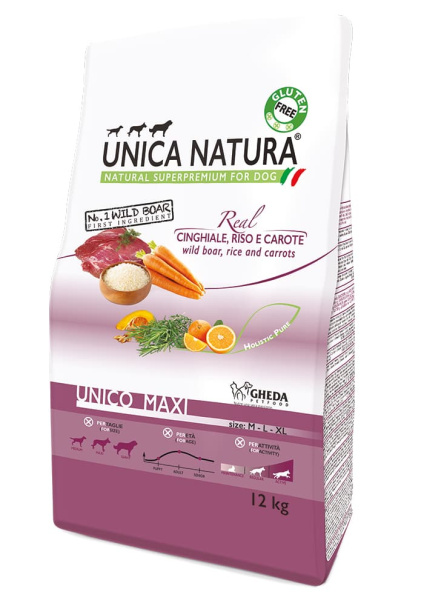 Unica Natura Unico Maxi (Дикий кабан, рис, морковь) - это сухой корм для собак средних, крупных и гигантских пород всех возрастов.