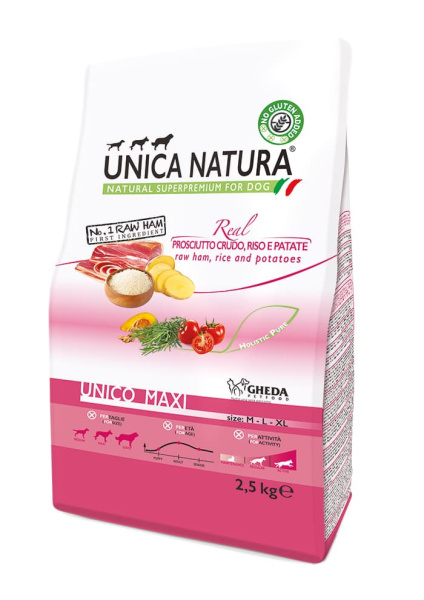 Unica Natura Unico Maxi (Сыровяленая ветчина, рис, картофель) - это полноценный корм для собак средних, крупных и гигантских пород всех возрастов.