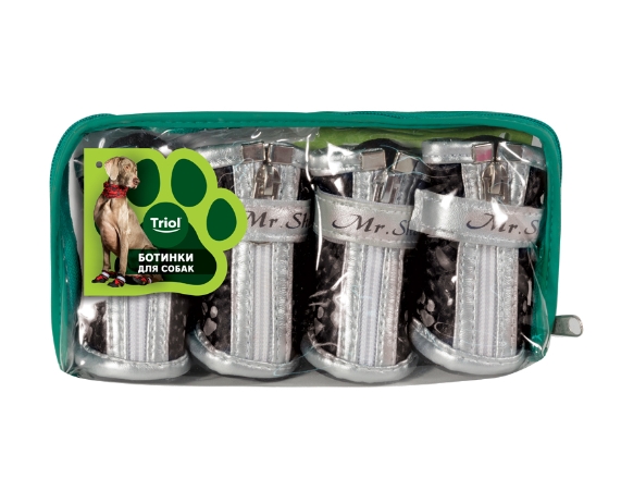Ботинки для собак черные Triol - комплект ботинок для собак с модным принтом и функциональной прорезиненной подошвой - незаменимый аксессуар индивидуальной защиты лап животного от воздействия агрессивных жидкостей, дорожных химреагентов, бензинов и масел на проезжей части дорог.