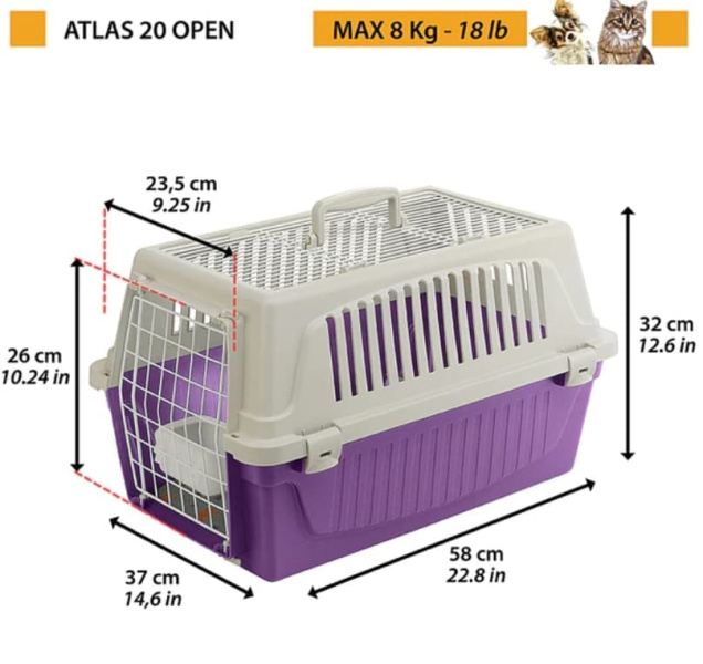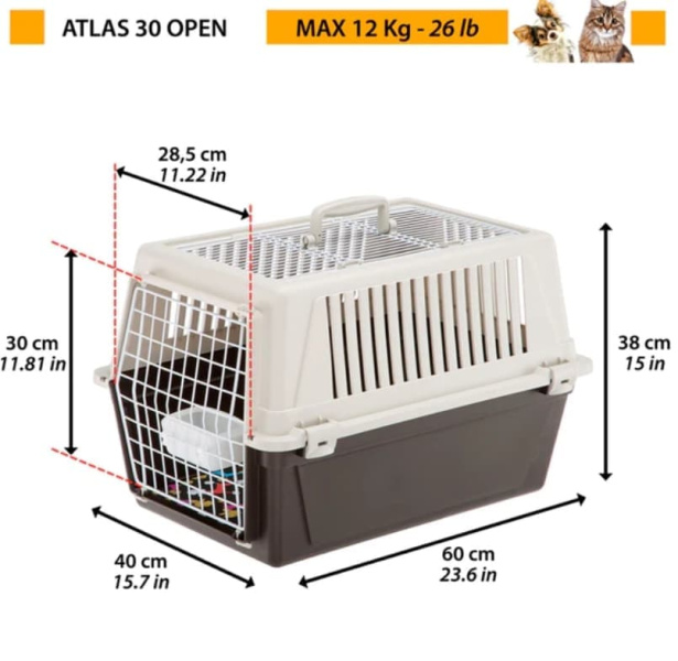 Предназначенная для кошек и мелких собак Atlas Open идеально подходит для переноски вашего друга с собой. Ее легко носить благодаря удобной ручке, она подходит, чтобы перевозить своих питомцев на большинстве популярных средствах транспорта (автомобиле, поезде, корабле, самолете). Эта пластиковая переноска выпускается со стальной дверкой, имеющей прочное пластиковое покрытие и закрывающейся снаружи с помощью защелок во избежание ненужных случайных открываний во время поездки. Еще одна металлическая решетка с пластиковым покрытием находится в верхней части. Она не только открывается, но и способствует лучшей циркуляции воздуха и улучшает обзор для вашей собаки.
