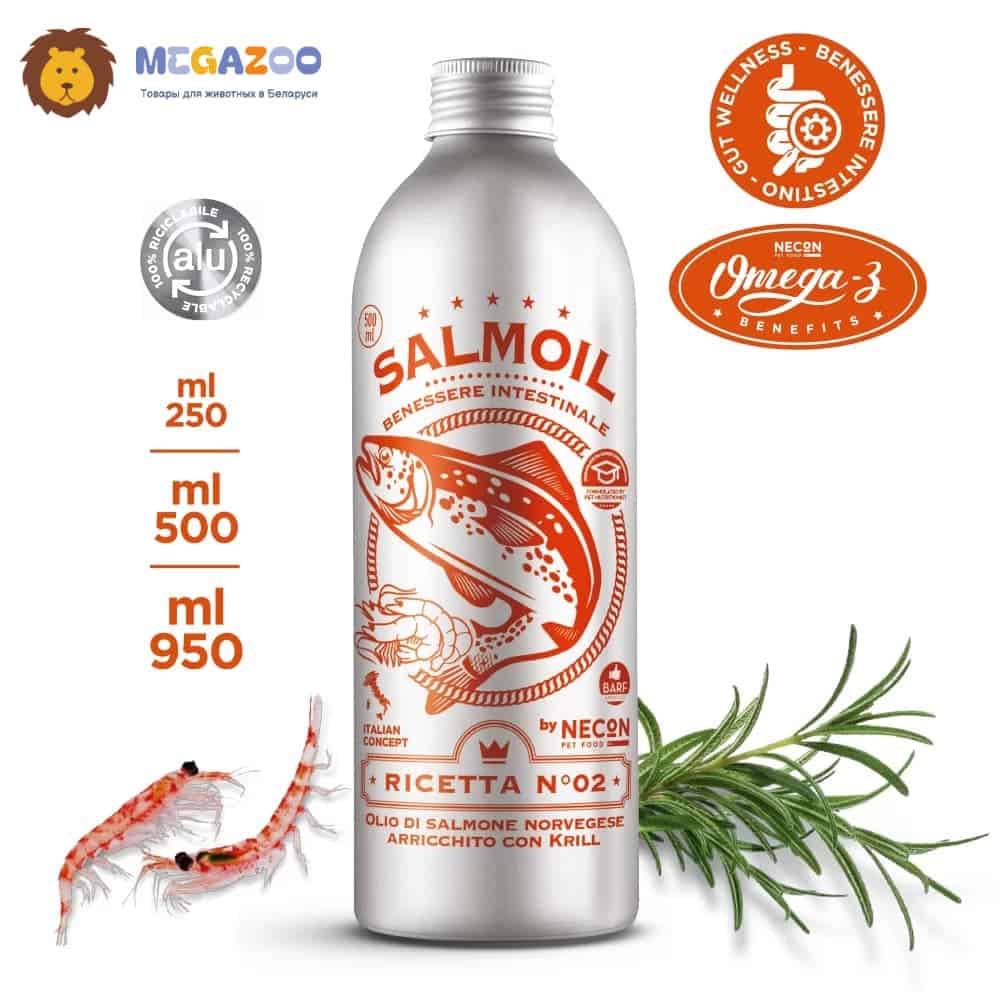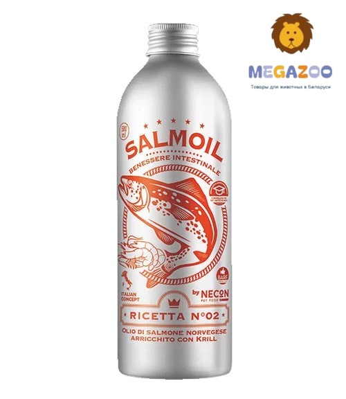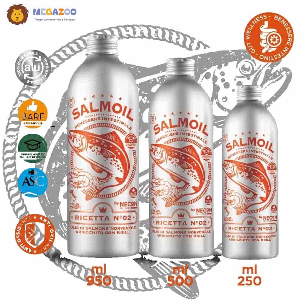 Лососевое масло NECON SALMOIL RICETTA 2 - это специальная пищевая добавка для собак и кошек с уклоном поддержки кишечника у животного.